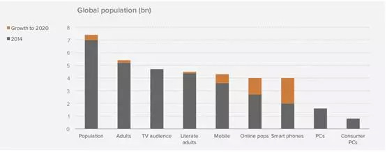 2020年全球人口數在74億左右;成年人數約52億人次;TV受眾48億左右;有文化和讀寫能力的人45億左右;功能機用戶43億左右;上網人數40億左右;智能手機用戶40億左右;PC用戶17億;個人PC用戶在10億以下。