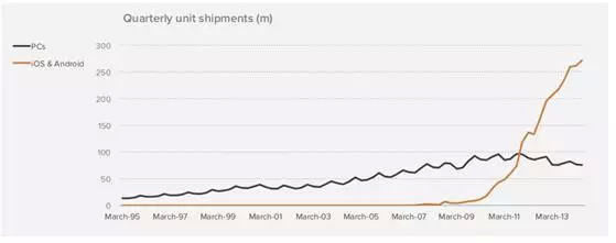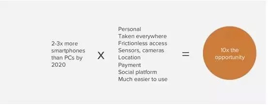 2020年,智能手機數將達到PC的2—3倍,但乘以移動設備便攜易用帶來的便利,移動設備將能提供10倍于PC時代的機會。