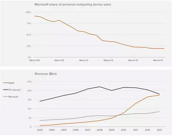 微軟在PC領域銷售份額持續下滑,已從超過85%份額,掉到不到25%;而蘋果卻快速占領市場,從收入看,幾乎接管PC業,在2013年達到1750億美金。
