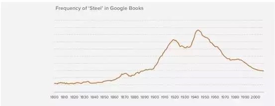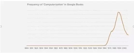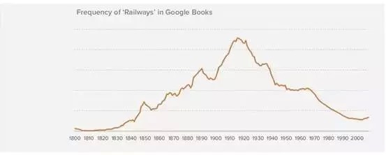 另一重要事實:當一項技術被充分普及,它就被社會“內化”成理所當然的一部分,人們也就不再談論它。以下幾張圖,顯示了“鐵路”、“鋼鐵”、“計算機化”等技術詞匯在Google Books出現的頻率: