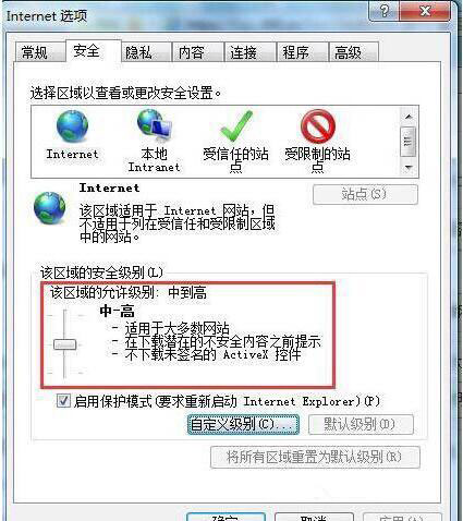 2、點(diǎn)擊“安全”進(jìn)入“Internet”點(diǎn)擊“自定義級(jí)別”。如圖所示: