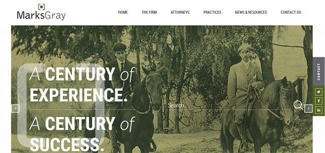 Marks Gray的開頭看起來很簡潔,但這不是問題。相反,網站看起來時尚而專業,這對于律師事務所來說尤為重要。導航很方便。商標和公司的名字一眼就能看出來,所有公司的做法都列了出來。另-件好事是這家公司在幾個社交網絡上都有賬戶。然而,如果你遵循同樣的策略,不要放棄你的賬戶一定期發布- 些東西。