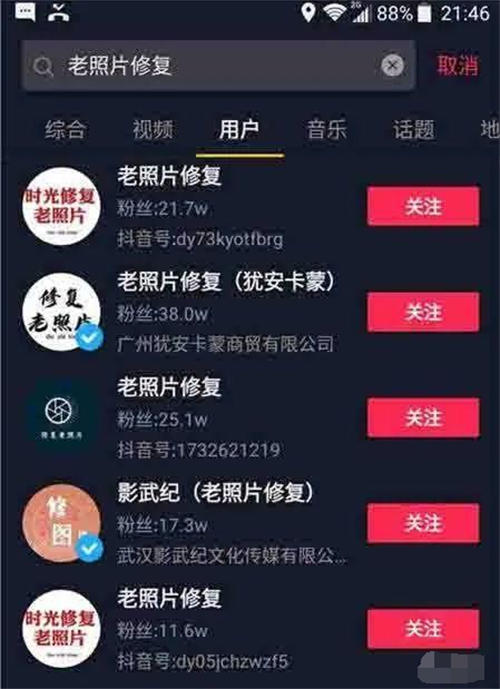 在某音一搜就有幾百個相關的賬號,很多賬號都是10W+的粉絲,想想多少潛在客戶?可以說,每個家庭都有老照片,能不能讓他們買單,就看你的本事了。