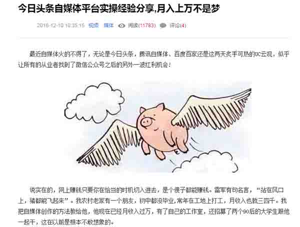 去年我寫過一篇文章《今日頭條自媒體平臺實操經驗分享,讓你月入上萬不是夢》,里面詳解介紹了自媒體運營的經驗。自媒體內容創業,真正想賺錢,有兩條路可走,要么賺平臺的廣告分成,要么推廣產品賺差價。只要你專注一個領域深耕下去,我們相信一年賺十幾萬還是很輕松的。去年我們一共寫了300多篇原創文章,收入200多萬,總的來說還算可以。
