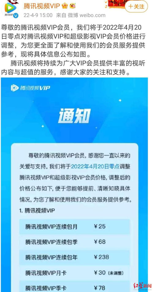 繼去年4月會員費漲價后,4月9日,騰訊視頻官方宣布,將在今年4月20日零點,對騰訊視頻VIP及超級影視VIP會員價格再次進行調整。