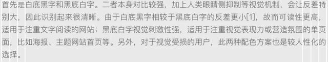 首先是白底黑字和黑底白字。二者本身對(duì)比較強(qiáng),加上人類眼睛側(cè)抑制等視覺(jué)機(jī)制,會(huì)讓反差特別大,因此識(shí)別起來(lái)很清晰。由于白底黑字相較于黑底白字的反差更小[1],故而可讀性更高,適用于注重文字閱讀的網(wǎng)站;黑底白字視覺(jué)刺激性強(qiáng),適用于注重視覺(jué)表現(xiàn)力或營(yíng)造氛圍的單頁(yè)面,比如海報(bào)、主題網(wǎng)站首頁(yè)等。另外,對(duì)于視覺(jué)受損的用戶,此兩種配色方案也是較人性化的選擇。