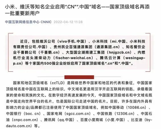 具體包括:維沃公司(vivo手機.中國)、小米科技(mi.中國、小米科技有限責任公司.中國)、貴州民企百強通源集團(通源集團.cn)、知名餐飲企業千喜鶴公司(千喜鶴.cn)、大型國企湖南建工集團(hnjgzcb.cn) 、內燃機行業龍頭濰柴動力(fischer-weichai.cn) 、騰訊云計算( wesingap-p.cn)等十家國內500強企業紛紛啟用了國家頂級域名".cn"和".中國"。