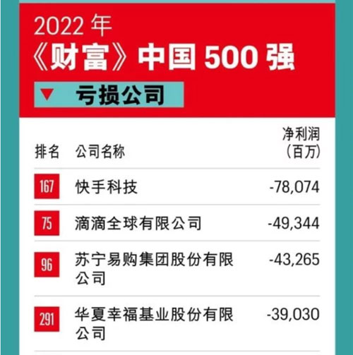 前段時間,2022年《財富》中國500強虧損公司排行榜出爐,快手以去年高達780億元的虧損位居榜首。