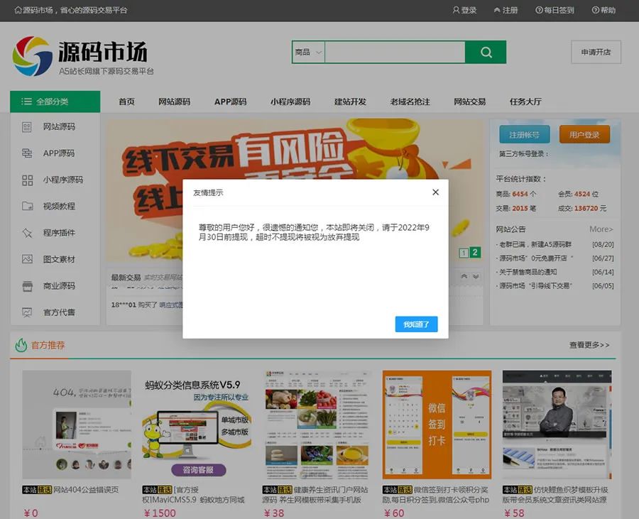 A5的源碼市場關站,這是一個與源碼交易為主的平臺,主要是賣一些網站模板、源代碼的。不過這個平臺這么多年做的一直不溫不火,也許是免費的、盜版的源碼太多了,站長也太摳了,正經的源碼交易都做不起來。