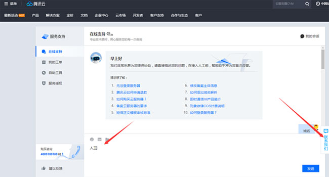 如果域名被qq攔截,不要直接去qq安全中心申訴,可以直接去騰訊云注冊一個(gè)賬號(hào),然后點(diǎn)擊右側(cè)的“聯(lián)系我們”,在彈出來的對(duì)話框里邊直接輸入“人工”,即可聯(lián)系上騰訊云的在線人工客服。