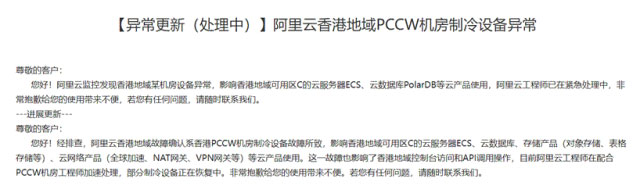 12月18日。由于阿里云的香港機房節(jié)點發(fā)生故障,導致包括澳門多家網站及App自當日午時起無法訪問使用。同日,阿里云發(fā)布公告稱:已在緊急處理中。