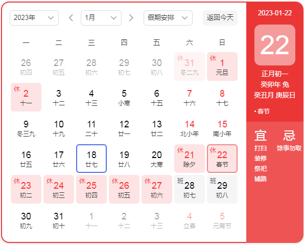 2023年1月19日(農(nóng)歷臘月二十八)至2023年1月28日(農(nóng)歷正月初七),共十天,2023年2月29日(農(nóng)歷正月初八)正式上班。