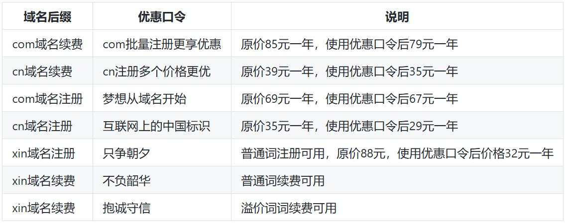 阿里云com、cn和xin域名購買注冊優惠口令及續費優惠口令如下: